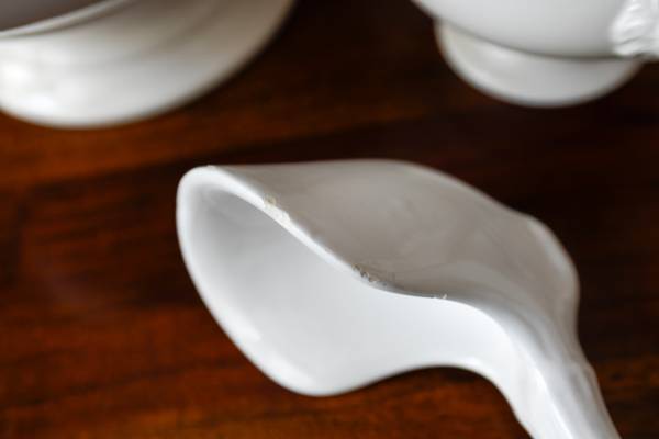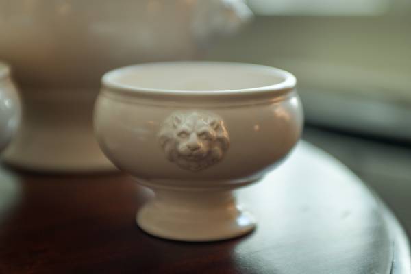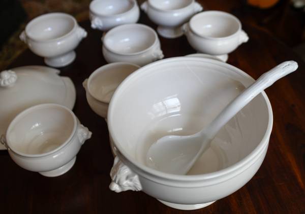 Nice vintage ceramic Lions Head Covered Soup Tureen and 8 matching bowls all in excellent condition, the bowls are good with no chips or cracks. The big tureen does have some light variations in color on one side and a small chip on the underside of the lid. The matching ladle does have some chips on the side, but it should not affect service should you want to employ them. These are a lightweight ceramic and not a heavyweight ironstone. I do not think these are microwave to table. What a delightful way to serve a stew or soup.