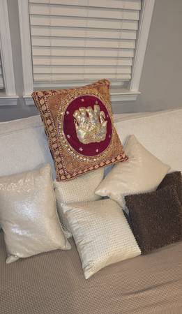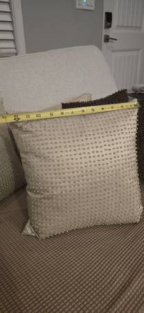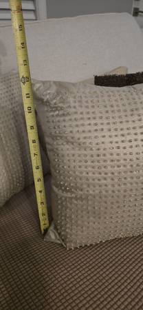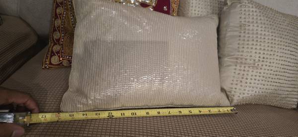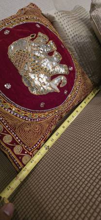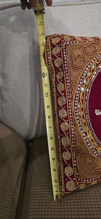 Please see all of the photos along with measurements within the photos. Selling seven accent pillows every throw pillow is practically brand new. With the exception of the red pillow which has a rip approximately 2 in on the seam which can be repaired if you desire. I am selling only the whole set. Not trying to waste my time to break up the set.