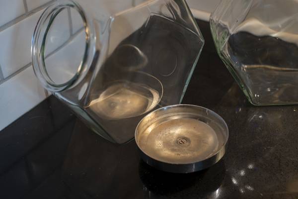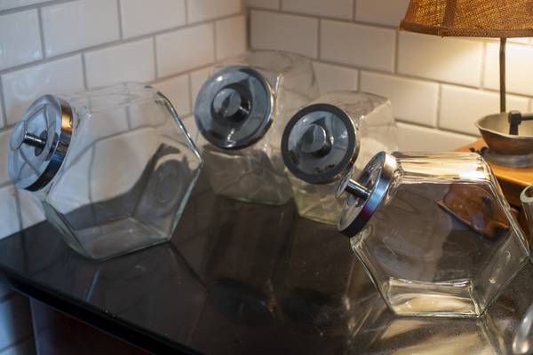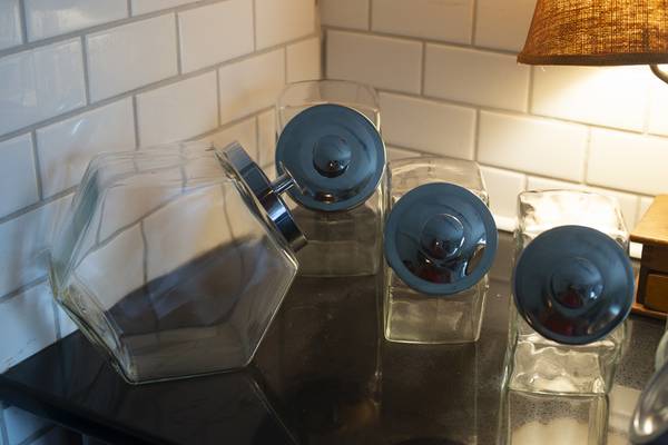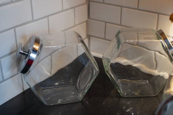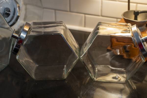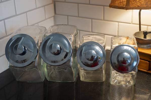 These vintage glass hexagonal food storage canisters are available in two sizes. Ten inch and Eight inches long. They are free of nicks and cracks. You can purchase them singly or as a set.