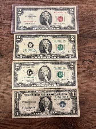 These are collectible legal tender notes, in good condition, the Red Seal $2 bill is a rare collectible. I’m throwing in the $1 bill in for free.Take a look at the bills closely if you want. I’ve had these for years and just looking to get some extra cash for them and if I do not sell it,that’s not a problem either. It’s going to remain firm on the pricing, take it or leave it, it’s gonna stay $300 for all 4 notes.