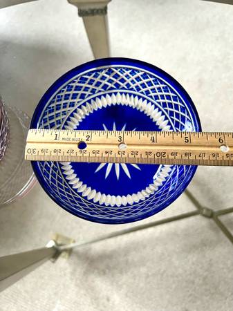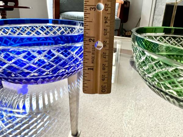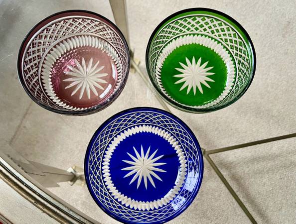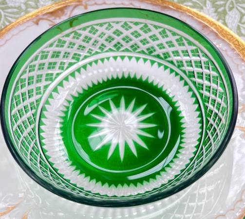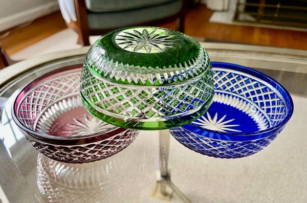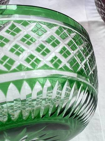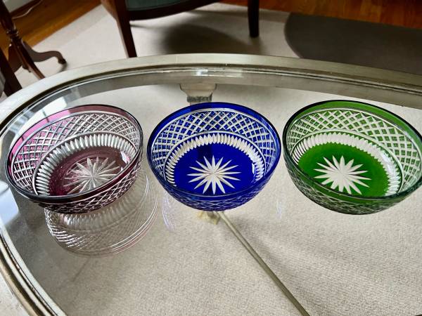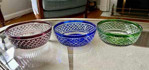 They are artfully made in cut-to-clear crystal, likely from Bohemia, and are in jewel-tone colors of amethyst, cobalt and emerald. Each is in excellent condition / looks like there was a small air bubble at the bottom on the purple bowl - see last photo.