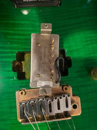 This is a late model Carvin C66. probably right before they became Kiesel. The guitar is in excellent condition with only a small finish crack on the back near the tremolo cover. Rosewood board. Gotoh two point trem is high quality. The gunmetal saddles are original. The pickups are U.S.A. Seymour Duncans (SH-1 bridge and SH-2 neck). They are PAF voiced and sound excellent. Five way pickup selector provides some coil split sounds. Abalone dots. Rosewood over baked maple neck with a satin finish on the back of the neck. Flamed maple top . Natural binding effect. The body looks like mahogany but may be alder. Locking tuners and gold hardware. Easy access neck heal. Medium jumbo frets. Abalone dot inlays. Very comfortable and easy playing.