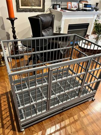 Large heavy duty dog (or any other pet)cage with gate. Cage is new was only used when my I love came for their dog. It has hinges so that if not needed can be folded bottom tray included, casters....