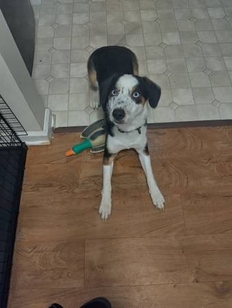 He's a growing pup who needs more space and attention than our small apartment and busy home can give him. I'm willing to provide his cage and any supplies we still have. He's a little shy around new faces but is a family dog. He's never shown signs of aggression. He is potty trained but will gladly mark areas around the room when you're not looking. He knows sit, down, shake, and will learn anything for a treat. We started his shots but became overwhelmed by the vet cost. He spends most of his time in doors but loves running and being chased. I'm not seeking any money, he just needs a place to be more active or at least someone who can show him love regularly.