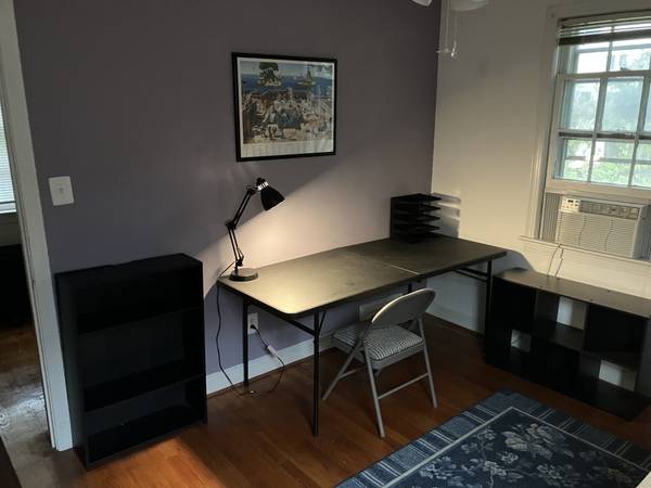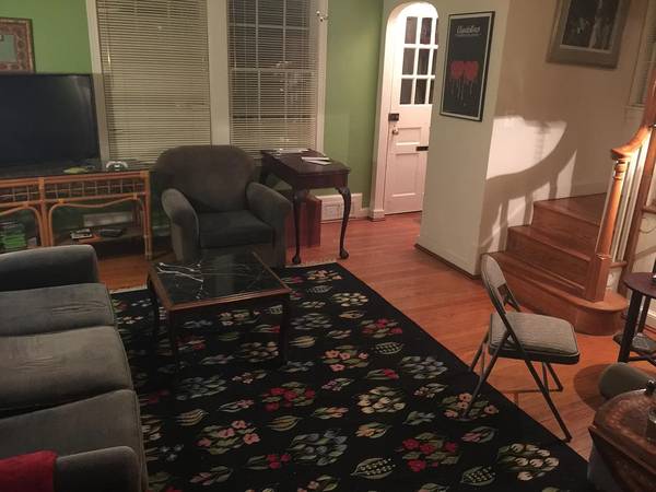 Rent a private room in a nice, clean, large, well-furnished brick colonial at the foot of Walnut Street NW, just inside the DC line. The shared features are: Restored 90s circa fully equipped kitchen, dining room, living room, and day room, 2 full bathrooms, free washer/dryer. The property's exterior includes a hang-out worthy front porch with swing, a big tiered backyard with free-standing deck, original tree sculpture, and garden beds on 3 sides. Located in the Takoma Park Old Town neighborhood, the location is walkable to the CVS drugstore, ACE hardware store, Starbucks coffee, Busboys & Poets bookstore and Sunday farmers market, only 4 blocks to the Takoma Metro station and 7 blocks from the TP/SS Montgomery College campus. Out of 3 private bedrooms on the second floor, one is available for December. It is 120 sq ft. (see image--fits queen bed, desk and chest of drawers) and has a full-size closet plus two southwest facing windows with views. The current housemates are both young men recently graduated from college. The owner lives on site in separate quarters in the basement. Rent is 825 + 1/4 share of utilities. Sorry, no pets.