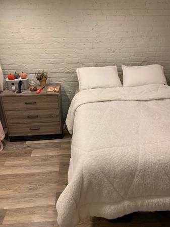 The room comes with a fairly new full-size mattress and bedframe. Pictures of how the room looks upon move in are shown. Pictures of how our roomie setup the room are also shown, for reference.