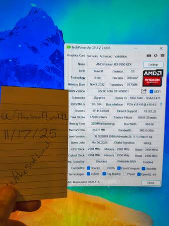 Timestamps: https://imgur.com/a/oC2GrOB $700 shipped or $650 local. Prefer local. DC/Baltimore area. Selling my Sapphire Nitro 7900 XTX. Works perfectly fine. Upgrading to a 5090.