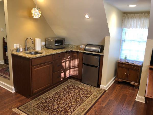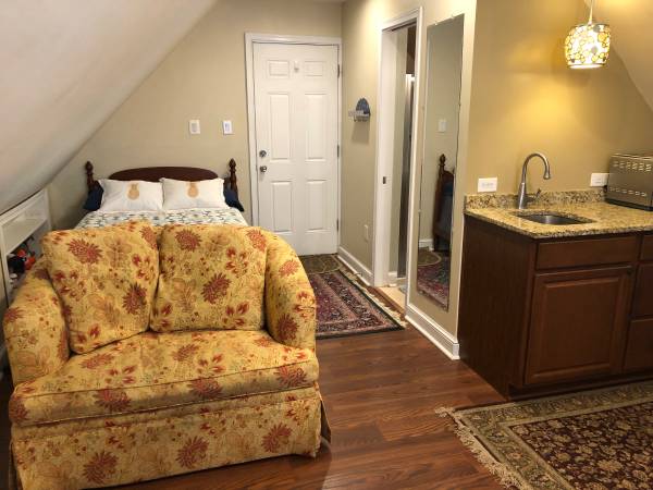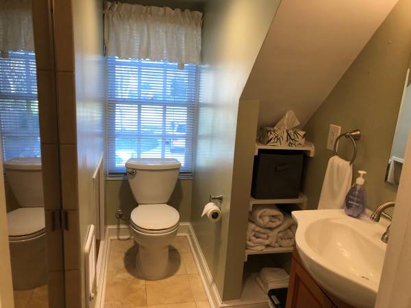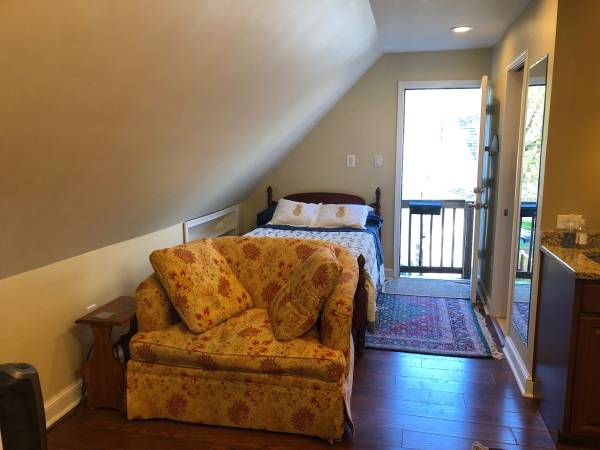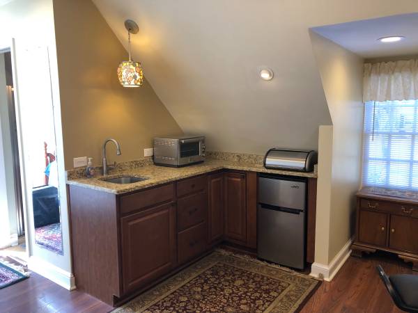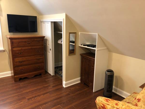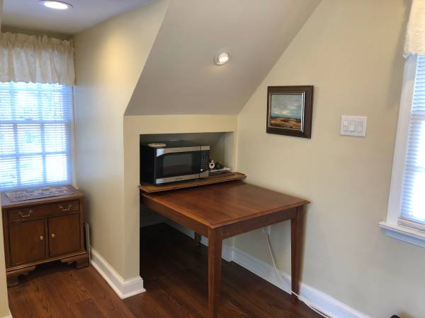 Beautiful, private suite located in residential neighborhood close to the DC line, Bethesda-Chevy Chase, NIH, American University & Georgetown University. This space is located on the upper floor of a detached garage. It features comfortable furnishings, mini refrigerator, and small kitchen appliances (microwave, convection oven), use of full-sized washer and dryer, TV, full size bed, AC, and area carpet with LVP floors. Included are all utilities, and high-speed WIFI. Plentiful street parking. Public transportation is just a quick walk. Bus stops located on nearby Massachusetts Avenue and River Road. All utilities included in monthly rent! Short term or long term lease available.