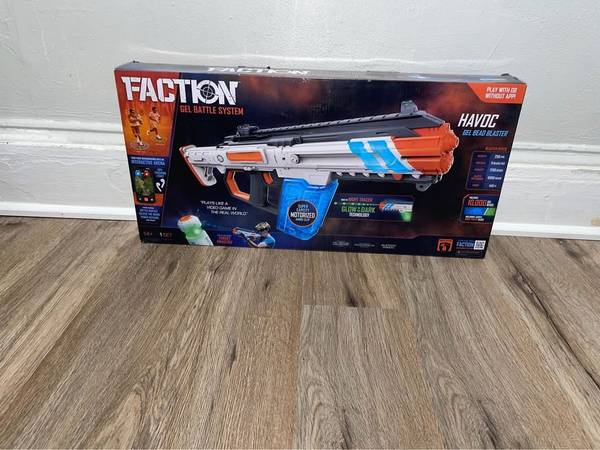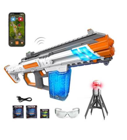 The Faction Havoc Gel Bead Blaster is a high-performance blaster designed for ages 14+. It features a motorized XL capacity bottom-feed ammo clip, allowing for faster and farther blasting. The blaster has a multi-function LED light display, built-in night tracer glow-in-the-dark technology, and Luma-Bright daytime glowing sights. It comes with 10,500 gel beads, including 500 sample glow-in-the-dark beads, and has three blasting modes: single fire, burst, and full auto. The blaster is Bluetooth enabled, connecting to the Faction Battle App for expanded gameplay features and has a built-in action cam mount. It also includes protective eyewear and a rechargeable battery.