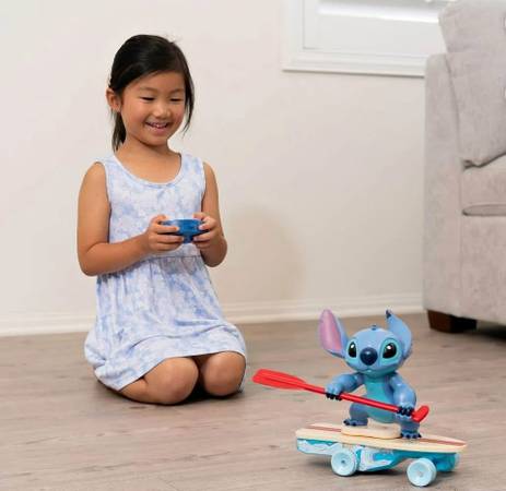 Ride the waves of adventure with the Surfer Stitch R/C by Jada Toys! Inspired by the classic film, this remote control toy captures the adventurous spirit of Stitch, making it one of the ideal Lilo & Stitch gifts for both girls and boys. Standing 10 inches tall, Stitch is ready to take on any challenge with his trusty surfboard, featuring cool graphics inspired by the film. With an interactive 360° spin function, this R/C toy lets you perform impressive tricks that will amaze kids and adults alike. The easy-to-use 2.4GHz controller offers precise control, allowing Stitch to move forward, reverse, and even execute J-turns, adding a layer of excitement to playtime. And with the self-righting feature, you can be sure that Stitch will always be ready for more fun, even if he tips over. Perfect for fans of Disney’s Lilo & Stitch, this toy brings the lovable character into your home, making it an exciting gift that captures the playful and adventurous nature of Stitch. Whether you're buying it as a gift for a young fan or adding it to your collection of Disney memorabilia, the Surfer Stitch R/C is an exciting addition that guarantees hours of entertainment.