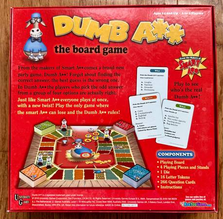 From the makers of Smart A** comes a new party game, The Dumb Ass / A** The Board Game Where The Wrong Answer Is Always Right! by University Games, a trivia game that challenges players to provide wrong answers to questions.