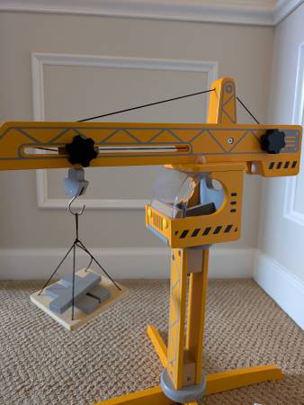 Like-new Hape Crane Lift, a beautifully crafted wooden construction toy for kids ages 3 and up. This interactive crane includes all original accessories: working pulley, construction blocks, cones, warning signs, and safety barriers—everything shown in the photos.