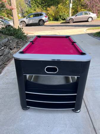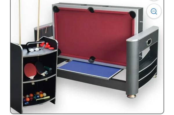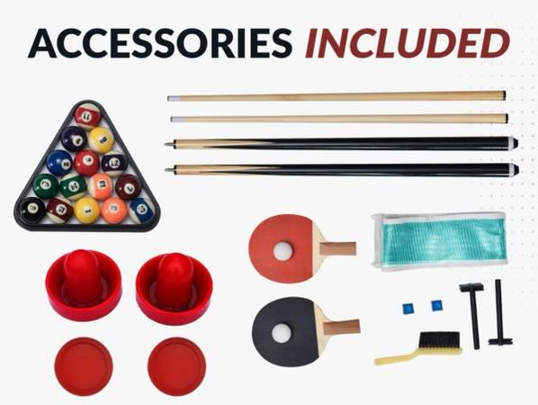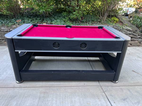 Hathaway Triple Threat game table. Easily rotate the table to play pool, air hockey or ping pong, while saving space with this 3 in 1 table. This is in good condition (scratches on the converters and ends) but even better than new -with reinforced solid wood bottom supports that replaced the weak MDF material. Dimensions are listed in the pictures. Weight is 195 pounds. Currently retails for $900.