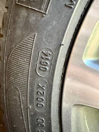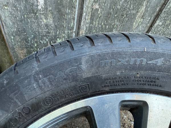 The mounted tires are 245/45 Michelin Primacy MXM4s, all with good tread remaining. While the date code shows 2014 manufacture, they were barely used on the vehicle and kept in covered storage since.