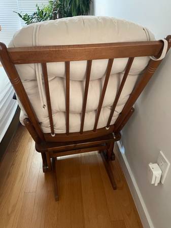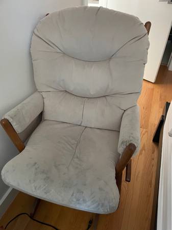 Comfortable rocking chair - wood with cushions. Well-loved, some discoloration of the fabric, but in pretty good shape other than that fabric which I think you could probably steam clean if you...