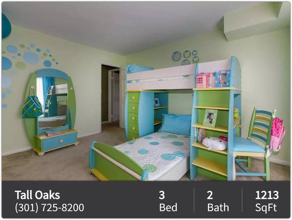 Tall Oaks Apartment Homes Address: 3515 Leslie Way Laurel, MD 20724 Pricing: $2430/Month | Bedrooms: 3 | Baths: 2 | Sq. Footage: 1213 sq ft | Terms: 12-Month Call: + + + + + + + + + + + + + + + + +...