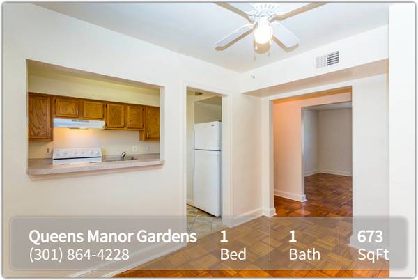 Enjoy tranquility at home with all the benefits of urban living just moments away at Queens Manor Gardens Apartments. Centrally located in Hyattsville, MD, in the city of Mount Rainier, Queens Manor Gardens Apartments are comfortably situated just minutes from West Hyattsville Metro, Prince George's Plaza, and Washington, DC. This garden style apartment community is comprised of newly updated homes combining classic architectural style with modern comfort and convenience. Each affordable one, two, and three bedroom apartment home features a newly remodeled kitchen with a large, sunny window, a formal dining area, and individually controlled heating and air conditioning. As a resident of Queens Manor Gardens, you'll enjoy quiet living in a wonderful park-like setting with an array of shopping and dining options, schools, and DC's many museums and attractions nearby. With easy access to the Capital Beltway and public bus service available at your doorstep, every convenience is within your reach.