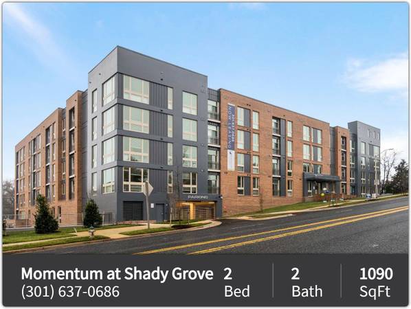 Welcome to Momentum at Shady Grove, a unique opportunity to live in luxury surroundings without having to pay an exorbitant rent. We believe you deserve the lifestyle you want without having to sacrifice on space, location or stretch your budget. Located adjacent to the Shady Grove Metro, your new home is brimming with features, amenities and service that is standard in new apartment buildings downtown. Imagine a commute that doesn't involve traffic hassles, but instead provides a chance to catch up on reading or time to relax and listen to music or your favorite podcast.