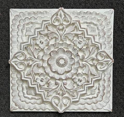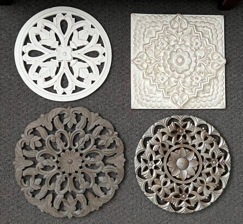 Wood wall carvings made in India. 16" x 16" Square $20 17 1/2" Round dark gray $20 15 1/2" White round $15 16" Dark brown/silver $20 See my other items with the "more ads by this user" link. ~ Kathy
