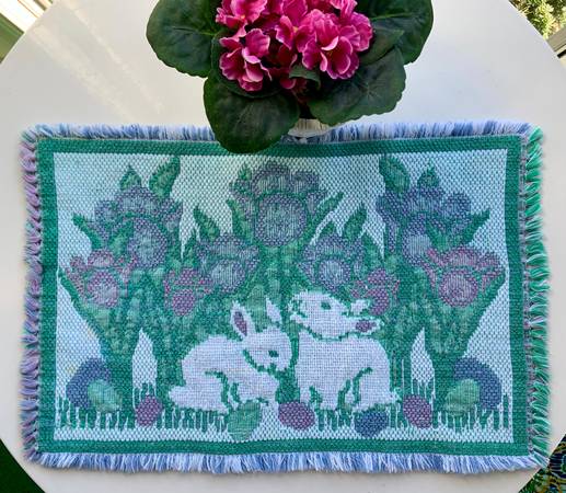 Easter Centerpiece Place Matt (17" x 12") * Cotten woven mat w/ rabbits sitting among flowers and Easter eggs. Perfect for your Spring backyard spread and the center of your Easter dinner table....
