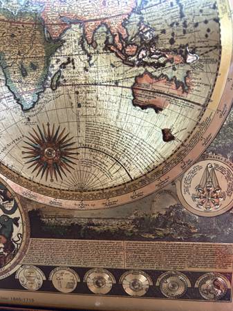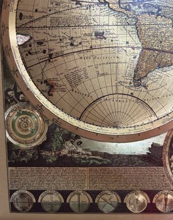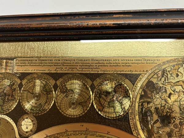 It is in very good condition. Close up photos show some of the map details and text. The photos show different shades of gold and other colors, due to the lighting and angles, and there are some reflections off the plexiglass.