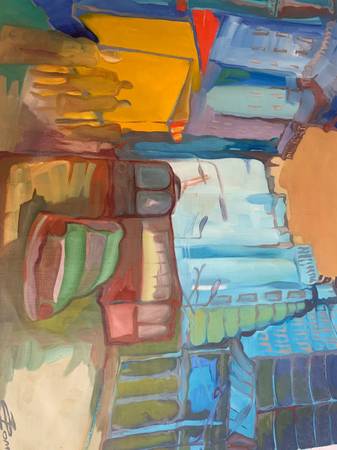 Beautiful oil-on-canvas painting by Belorussian artist Igor Fomin who currently resides and creates in Spain. His style was inspired by the vibrant Spanish colors and by the works of Picasso. This is his earlier work made in 1990 in Minsk, Belarus. It was purchased by a relative of ours. The painting is unframed and measures 35.5” by 27”. Great condition.