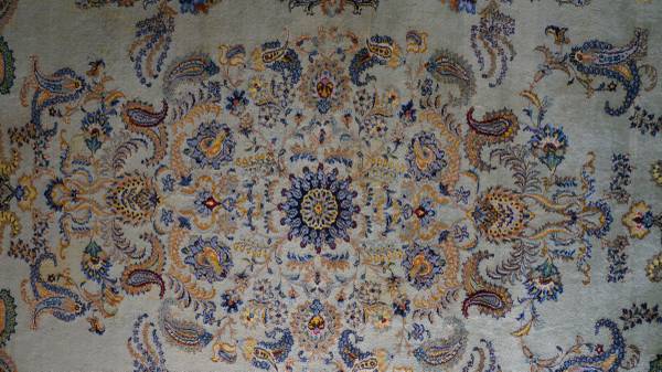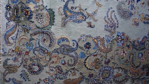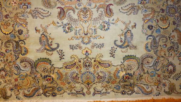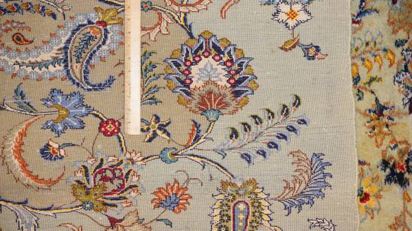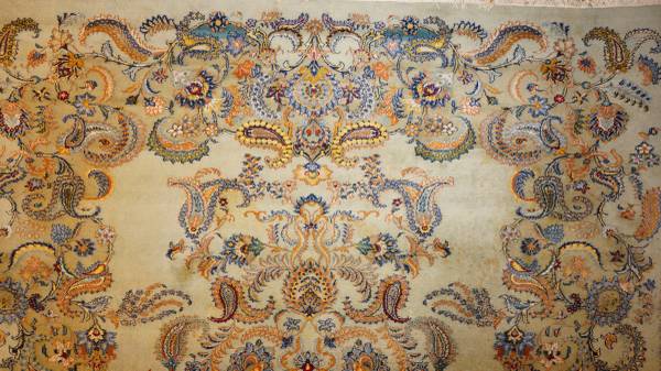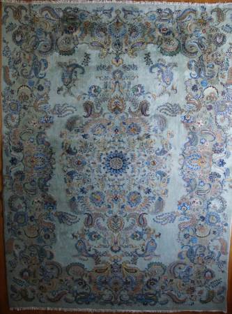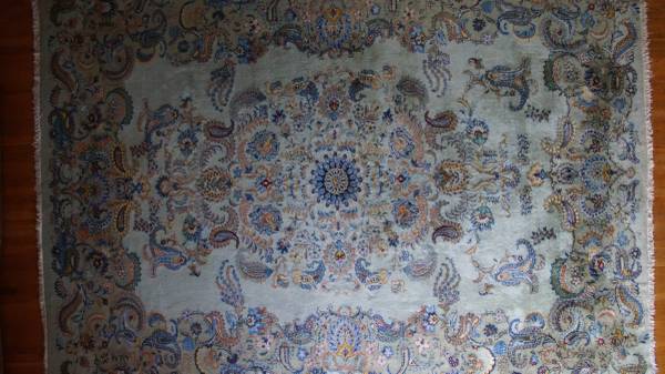 Authentic scarce vintage Persian rug from the 40's-50's. The trendy sea-foam color and the paisley pattern affirm the age of this beauty and it is very consistent with its' natural wear . 10'x13'5" very tightly knotted (last image) baby lamb's wool dyed with natural herbs. It is in a fair condition for the age, normal wear no holes with a few area missing pile, images provided. It has been cleaned, from a smoke free pet free home.