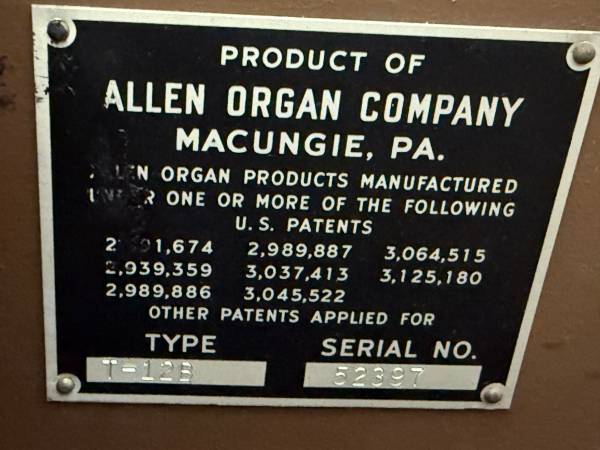 For sale is a vintage Allen T-12B console organ (serial no. 52397), built in the early 1960s by the Allen Organ Company in Macungie, PA. This package includes: Allen T-12B console (2 manuals, full...