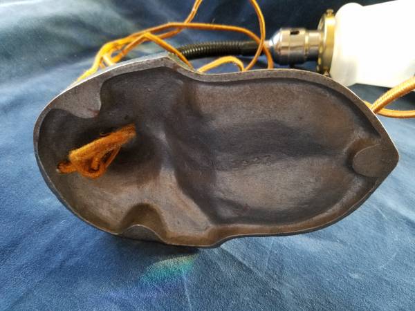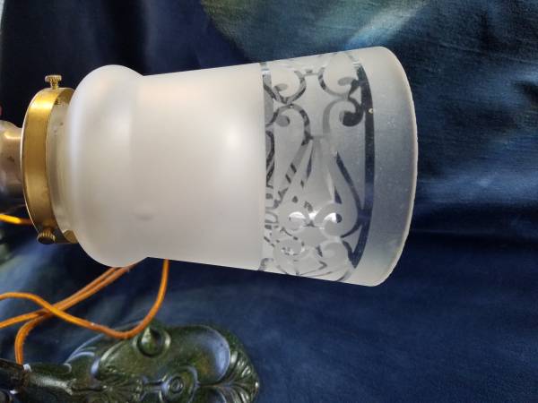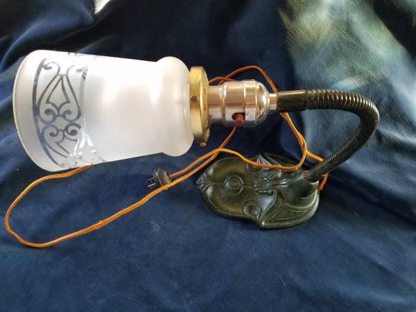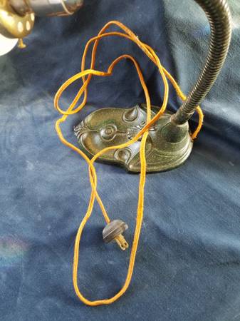 Cast Iron Base Goose Neck Lamp with original wiring and plug, glass shade with small rim chip, working. Very nice Art Deco lamp, base lovely green tones. Base marked: 1927.