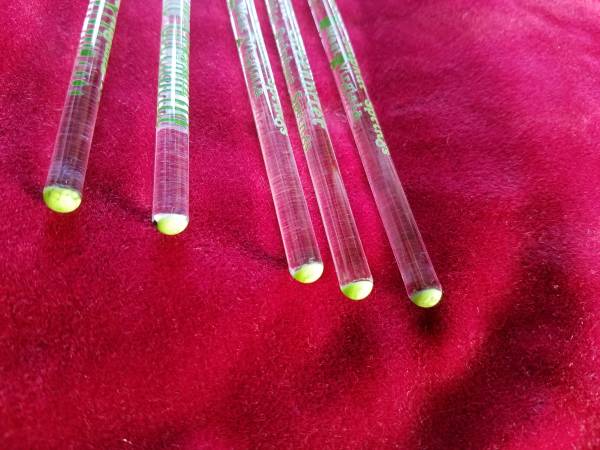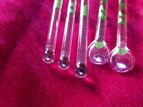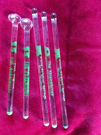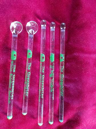 Three straight Greenbrier Glass Swizzle Sticks with Green advertising and end cap, six inches long; Three (I found the third) cupped Greenbrier Glass Swizzle Sticks with Green advertising and end cap, five inches long. All Six for $100. Wonderful small treasures from the Greenbrier to use at your parties or dress up your personal bar.