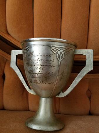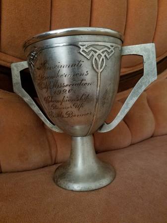 Cincinnati Lumbermens Golf Association 1920 Championship Runner Up E.M. Bonner. Art Deco trophy by Heintz Art Metal Works, sterling over bronze, six and a quarter inches tall, four and a half inches across the top of the bowl, seven inches from handle tip to handle tip. Heintz Art Metal Shop, 1906-1935. Please excuse my poor photos with reflection.