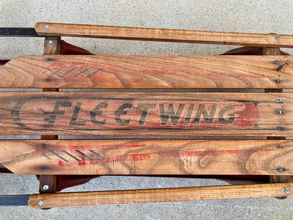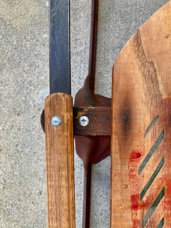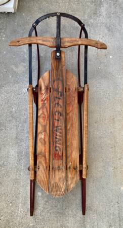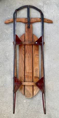 Manufactured by Auto Wheel Coaster Co., North Tonawanda, NY, this sled can be part of a holiday display or can be used for snow sledding. Constructed of northern white ash with high carbon spring steel. Measures 45” L x 13” W x 6” deep; steer handle measures 22” across. One repair – see photo.