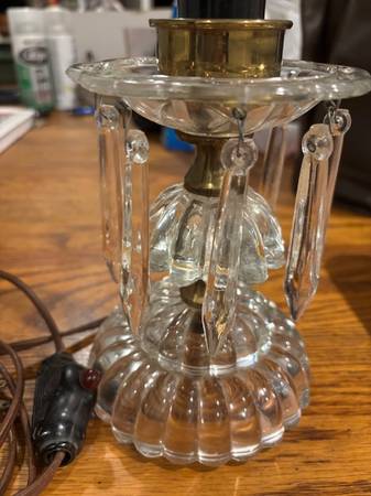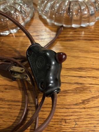 Wonderful pair of crystal Boudoir lamps. Has a very nice snap toggle switch with a patent number 1638828 which was issued in 1927. Needs new cords! Missing a few prisms and the hurricane shades. Will be a very handsome pair when helped. About 8" tall to base of bulb and bsse is 5"wide.