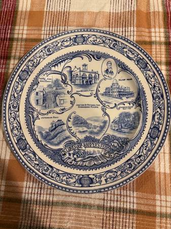 10" plate Picturesque Harper's Ferry, features John Brown's Farm; Hilltop House; The Harper House; Junction of Potomac and Shenandoah Rivers; John Brown's Fort; Solid Rock Steps and Catholic Church Jefferson Rock. No chips, cracks or discoloration. Old English Staffordshire Ware. Made in Staffordshire England.