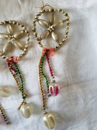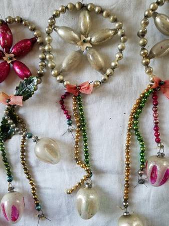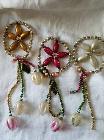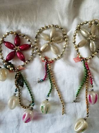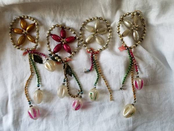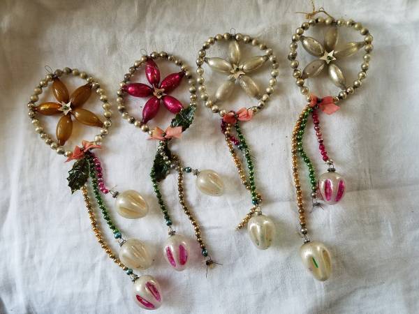 Four Fabulous Mercury Glass Stars, Flowers, Snowflakes with dangles. Some ornaments at end of dangles missing, but could be replaced with similar ornaments. Some artificial holly leaves missing. All four for $80. Two silver, one red, and one gold. Rare Christmas Ornaments.