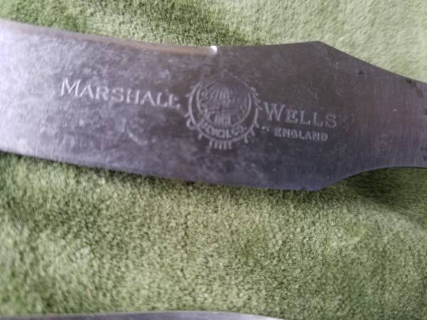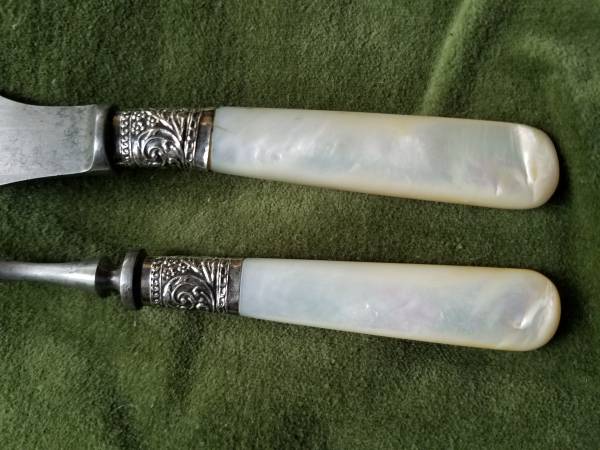 Small Carving Set, ornate Sterling bands, Mother of Pearl handles, Marshall Wells, England. "MARSHALL-WELLS HARDWARE CO - Duluth, MN A hardware wholesaler founded in 1886. The firm used the trade mark Zenith." It would seem they imported either parts or whole items from England. Knife is nine and a quarter inches long. Fork is eight inches long.