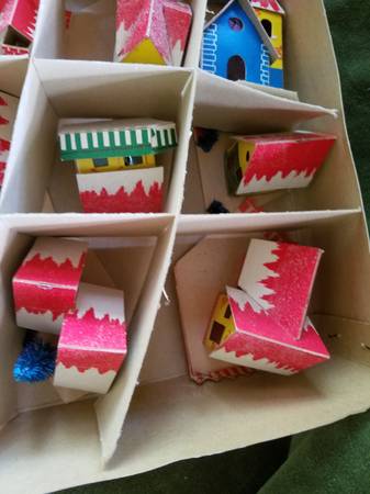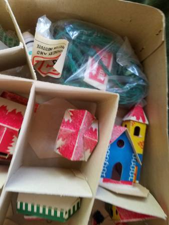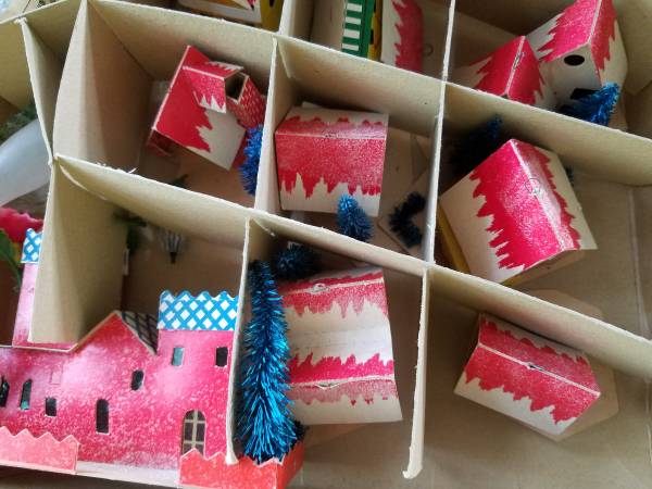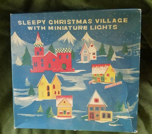 Original box, complete, Sleepy Christmas Village With Miniature Lights, Cardboard, Glitter, Mica. Art 48 12382 Volts 110 Made in Japan Wonderful vintage Chritmas Putz village.