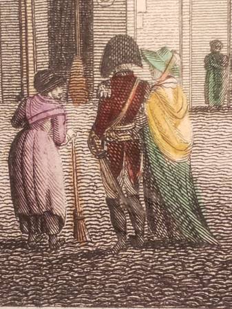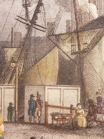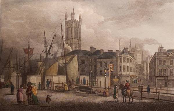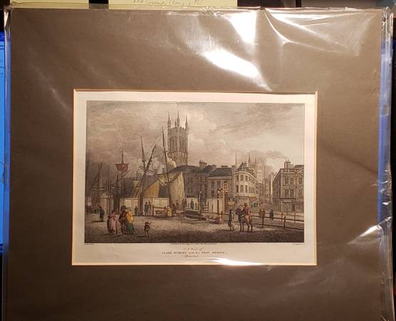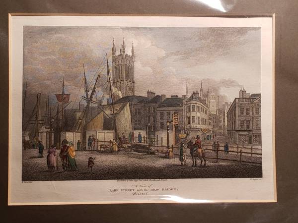 English antiquarian print "Clare Street with the Draw Bridge", 1808. I purchased this about 40 years ago from an antique dealer in England. It is still in the cellophane wrapper, unopened, and I have stored it in the dark. It is in excellent condition.
