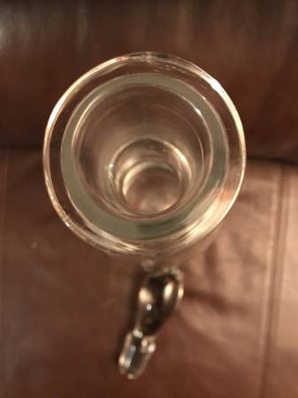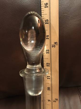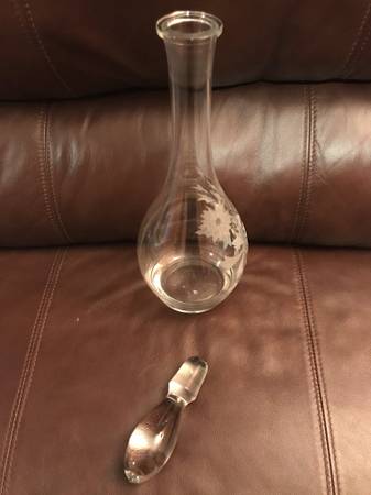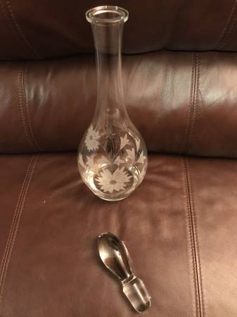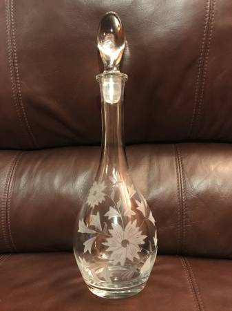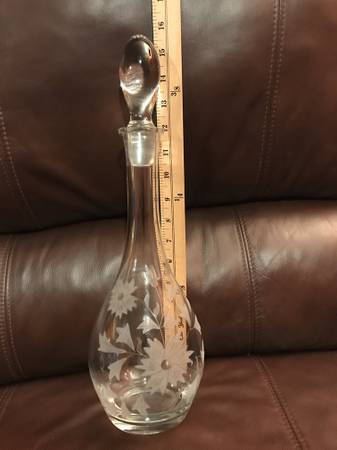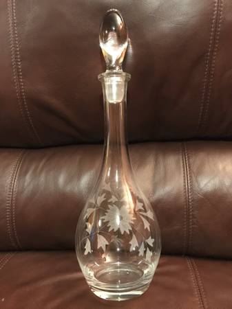 Vintage etched leaf cut glass decanter liquor bottle glass stopper. Approximately 16" tall. Vintage Mid Century. Original. Excellent gently used condition. If you are reading this YES, IT IS STILL...