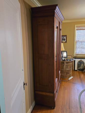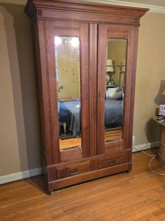 vintage wardrobe/armoire ,was told it is walnut, or looks similar to cherry, not sure, very old , sold house and parting with this beautiful piece , currently taken apart for easy transport, a few screws and wing nuts to assemble , mirrors have some silver peeling but original and easy to replace, but like vintage look , approx size 86" tall ,48" wide , 18" deep ,top of wardrobe is 54" wide due to crown work , dove tail drawers, shelves removable , holes cut in back if you want to use for tv, INTERESTED OR QUESTIONS SEND NAME PHONE # AND BEST TIME TO REACH YOU