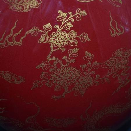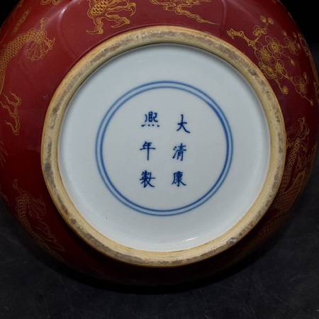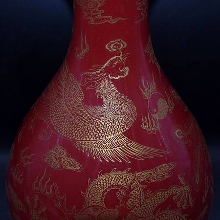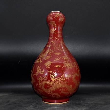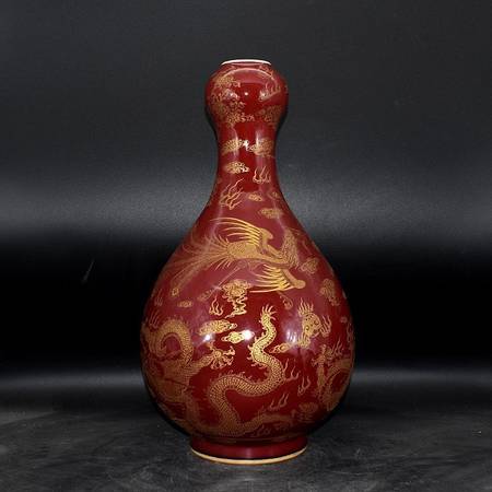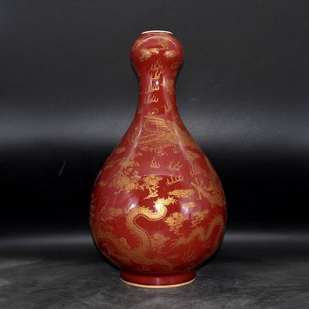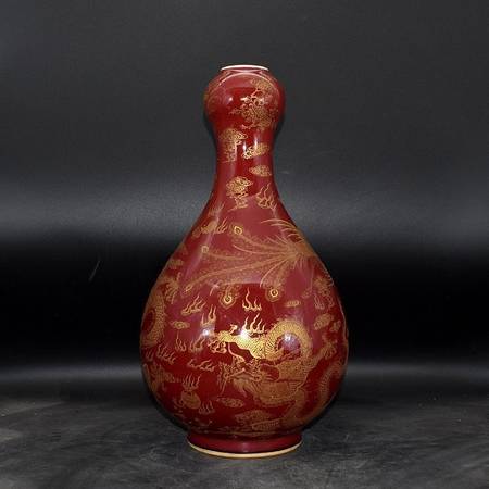 A treasure from the Kangxi official kiln, this imperial red glaze features gilded dragons and phoenixes, and its garlic-shaped vase embodies ancient charm. This rare Chinese antique porcelain is available overseas, making it a perfect collector's/decoration choice!