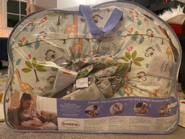 Boppy Feeding & Infant Support Pillow in like-new condition. Comes with 4 zippered pillowcases in adorable prints. Purchased new this runs double at $50 https://a.co/d/aY5ksXn Cash only