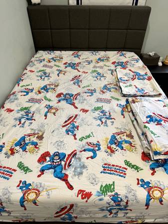 All items are from Pottery Barn Kids and gently used. From a pet-free, smoke-free home. 100% cotton – Full/Queen size. Pic 1: Captain America Sheet Set Includes 1 fitted sheet, 1 flat sheet, and 2...