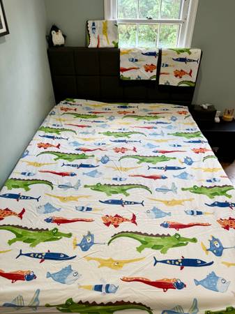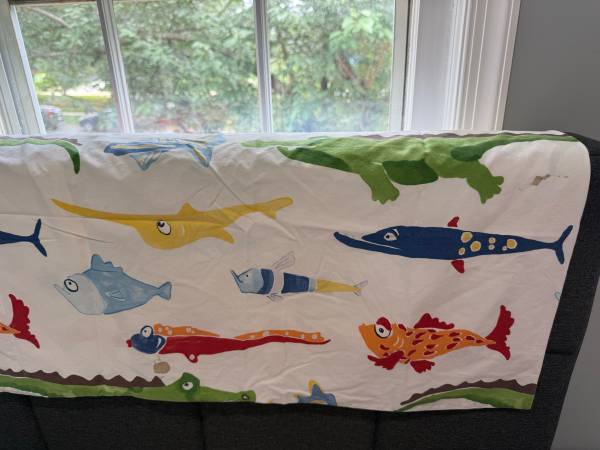 Features a fun, colorful ocean print with fish, stingrays, crocodiles, and more.