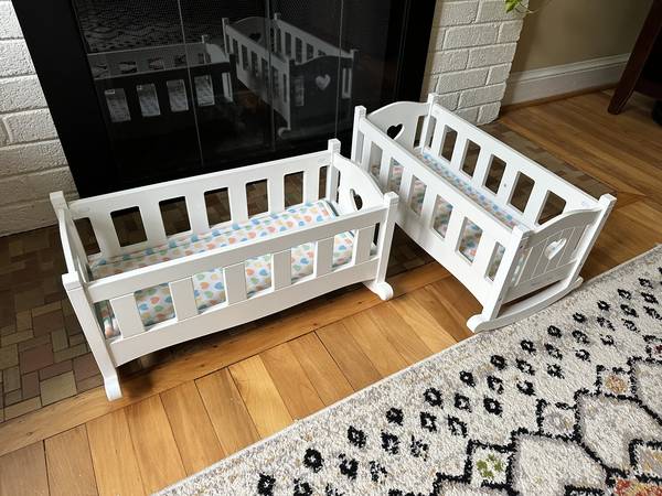 White wooden rocking play cradle for dolls and stuffed animals up to 20 inches tall.
