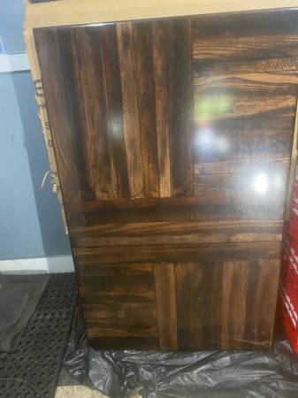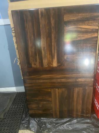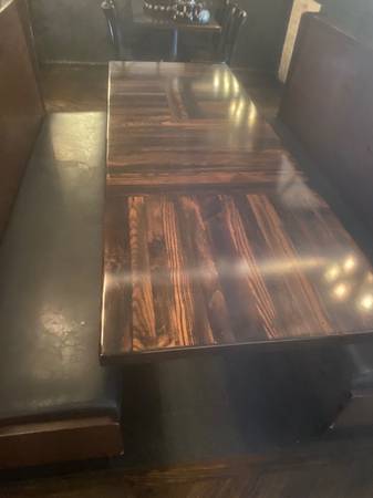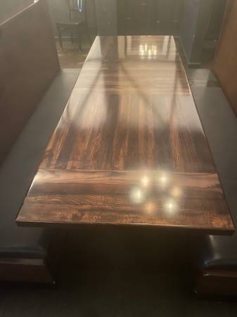 These are BEAUTIFUL custom made Restaurant Large party Tables . They are 84” L x 30” W . They were manufactured by Table Topics . The finish is full filled grain acralyte matte . The inset is multi-species barnboard RL-RW . The outer frame is multi-species