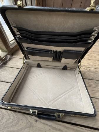 Black leather (or faux leather, I can't tell) briefcase, lockable, with many pockets inside. Slightly scuffed on the outside, like new inside.