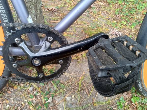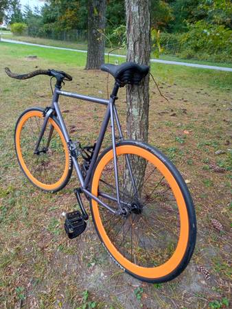 This Pure Cycles Original Series Road Bike is currently set up as a single speed. The bike has a flip-flop rear hub so it can quickly turn to a fixed gear road bike. It is equipped with front Tektro caliper brake, bull born handlebar, Wellgo pedals with straps, upgraded gel saddle, and dual water bottle cages. I am asking for 280 or best offer for the bike.