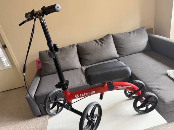 Knee walker scooter suitable for those recovering from a broken foot, ankle or leg, foot or ankle surgery.