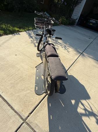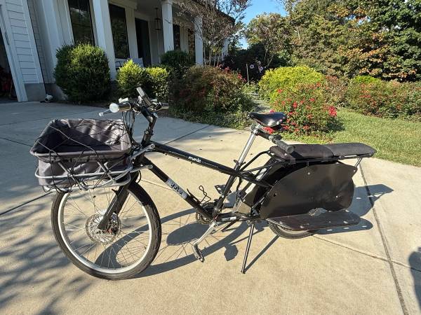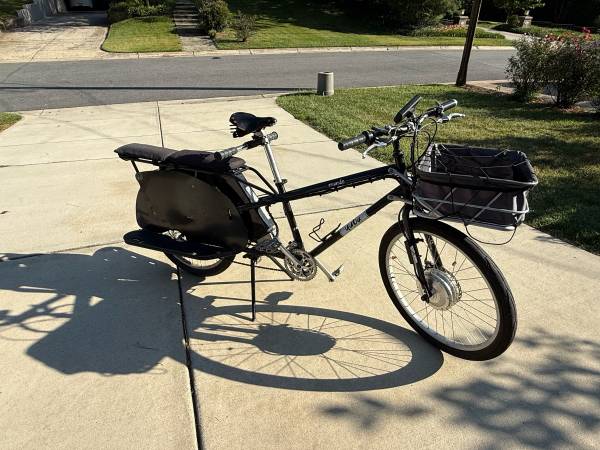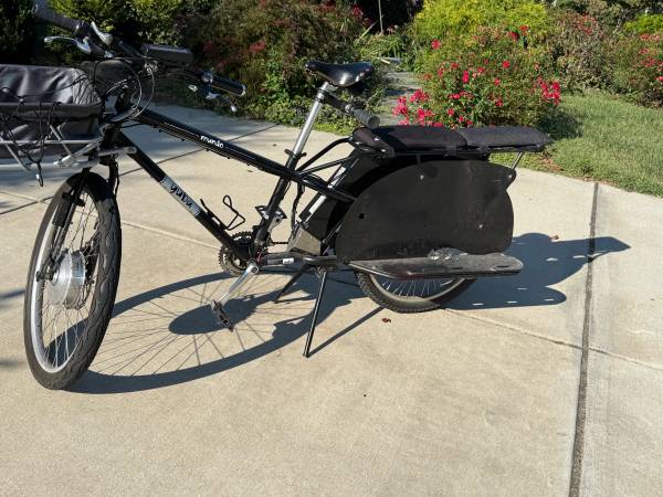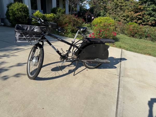 Electric cargo bike for sale. Perfect condition. Holds up to 750 lbs. Great for taking kids to school or running errands. Reconditioned battery. New brakes and cables. Padded seats. Brooks leather...